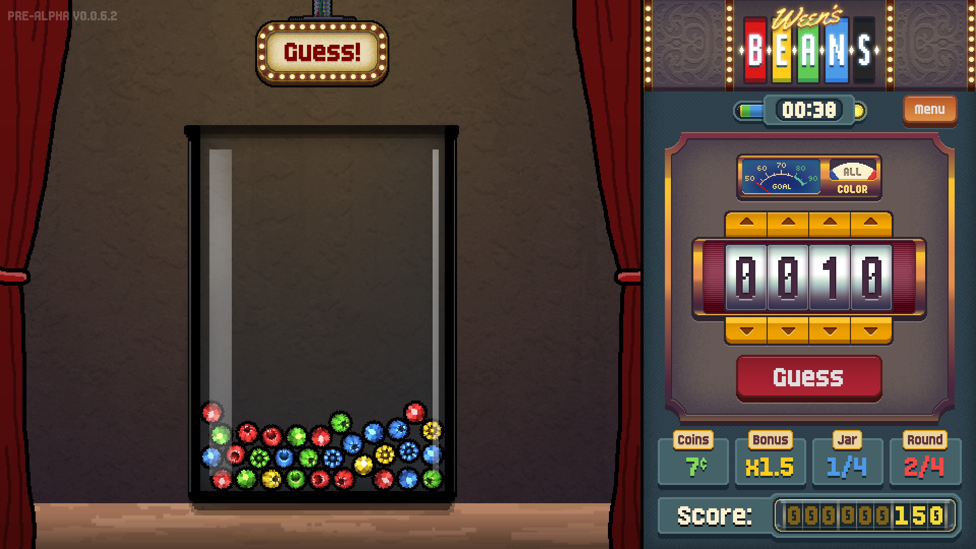 - Guess the beans! Each round, estimate the total number of beans in the jar. To pass a round, your guess must be more accurate than the round’s goal value.